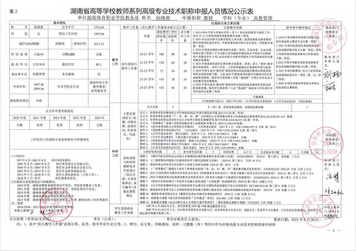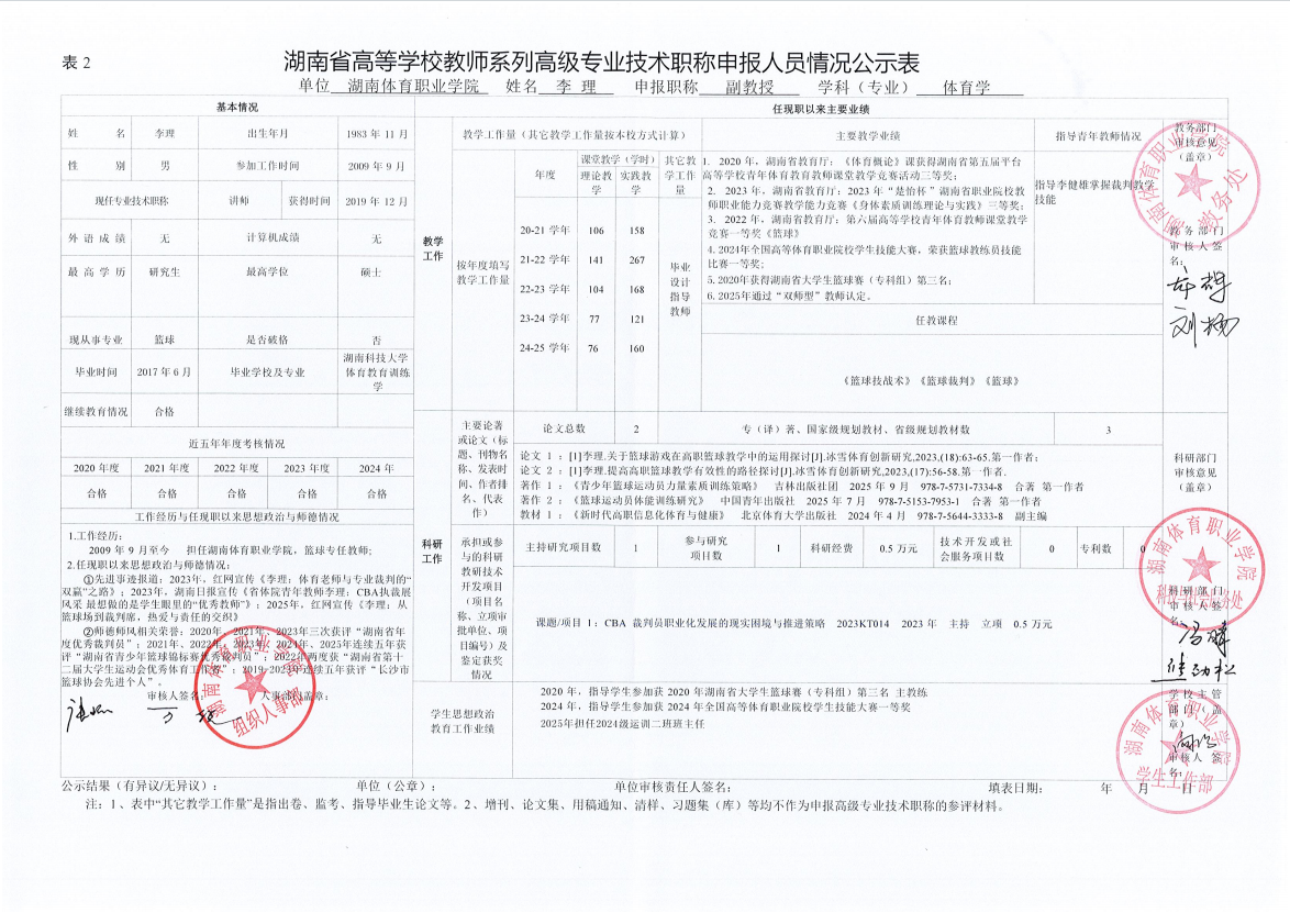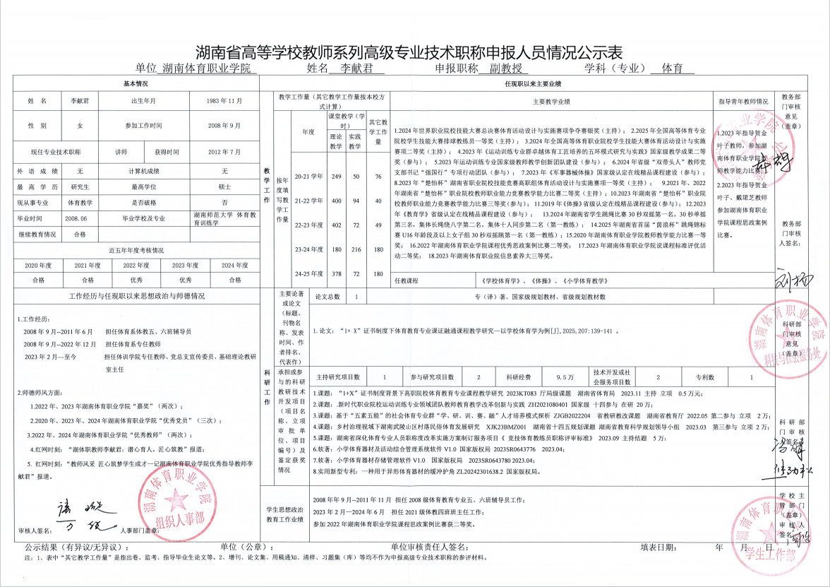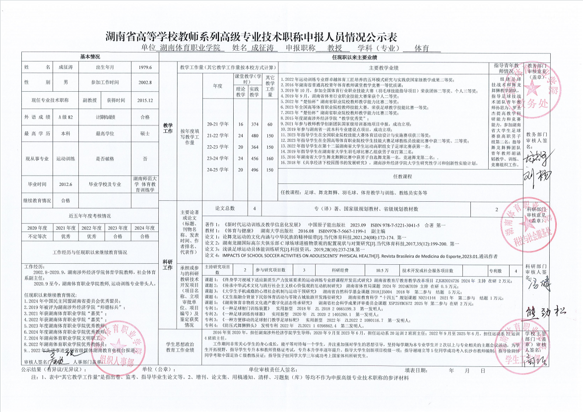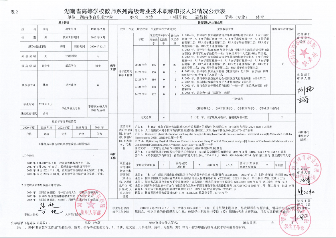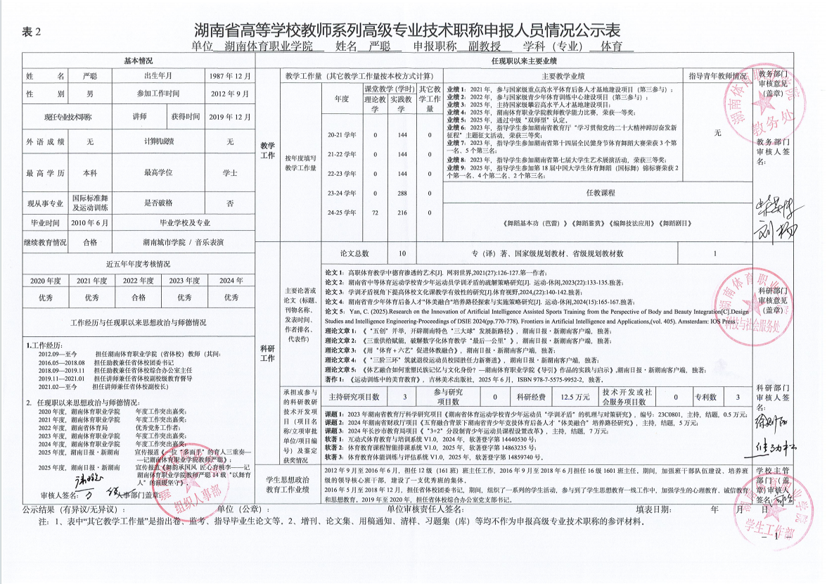根据湖南省教育厅、湖南省人力资源和社会保障厅《关于做好2025年度全省高级职称评审工作的通知》(湘人社函〔2025〕29号)、《高校教师系列专业技术职称评审改革工作实施办法》(湘体职院职改字〔2022〕9号)、《2025年高校教师系列专业技术职称评审工作方案》(湘体职院职改字〔2025〕10号)等文件要求,经个人申报、部门推荐、资格审查委员会和测评考核委员会审核等程序,现将2025年度学院申报高校教师系列职称评审的人员情况予以公示,公示期为5个工作日,自2025年10月14日起至2025年10月20日止。
