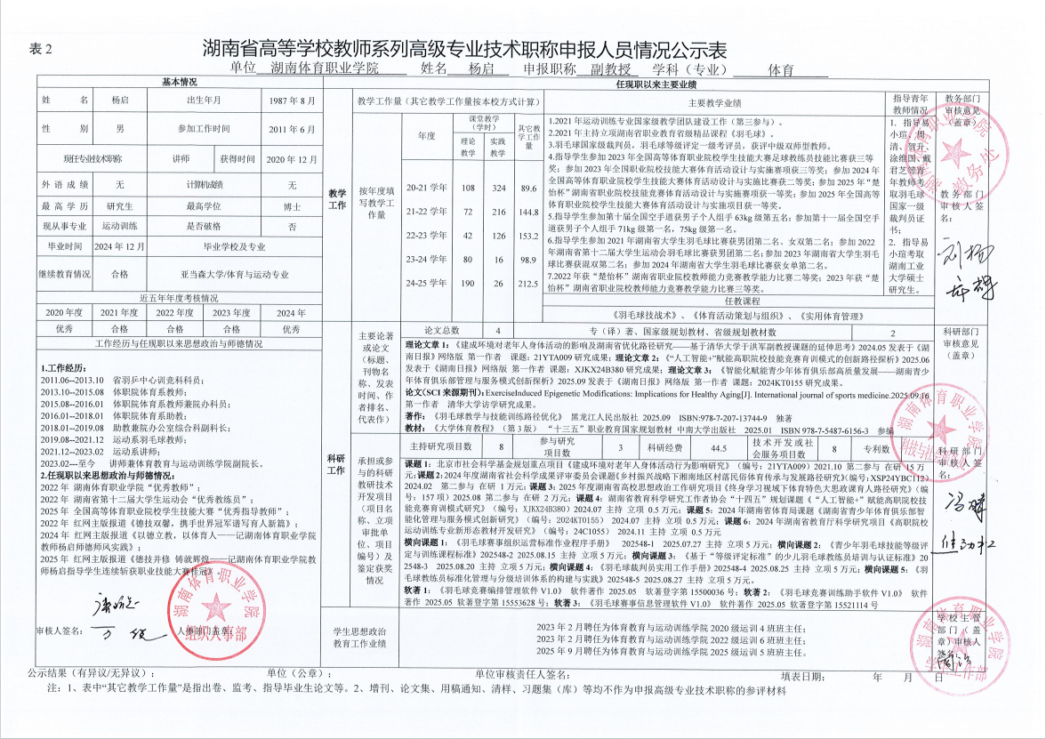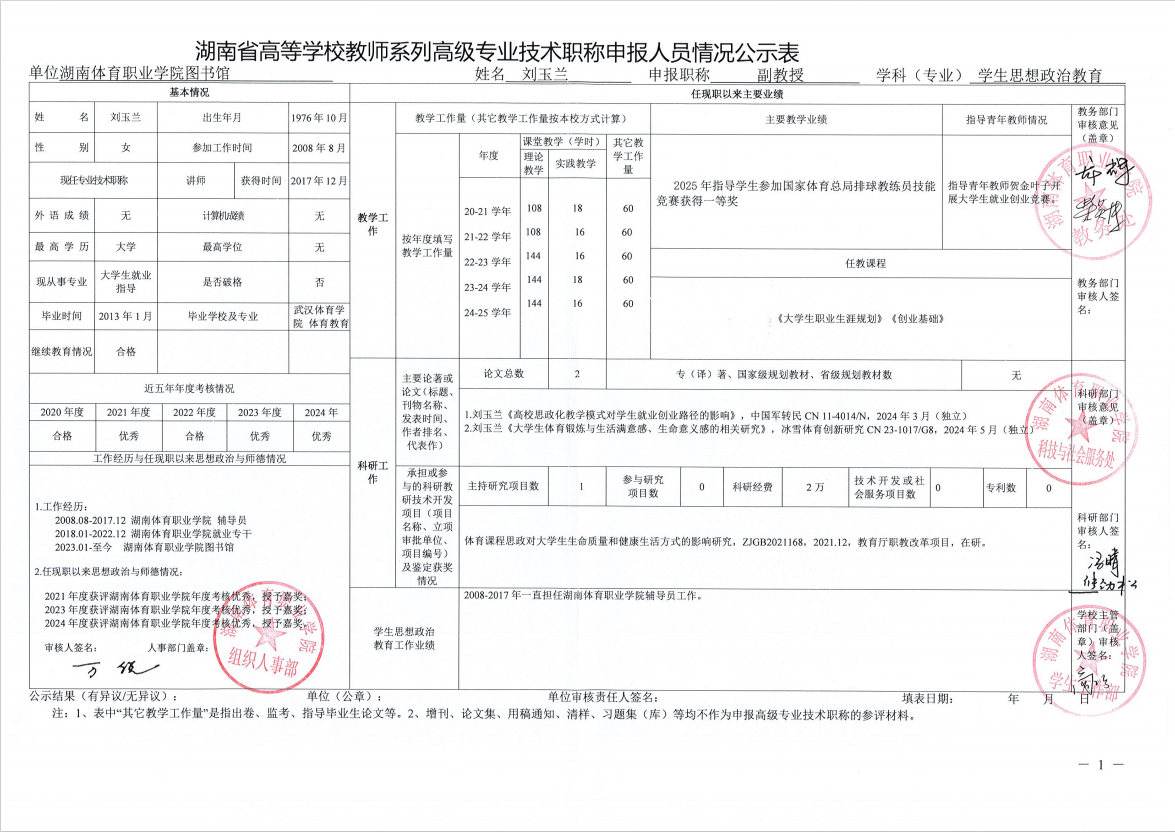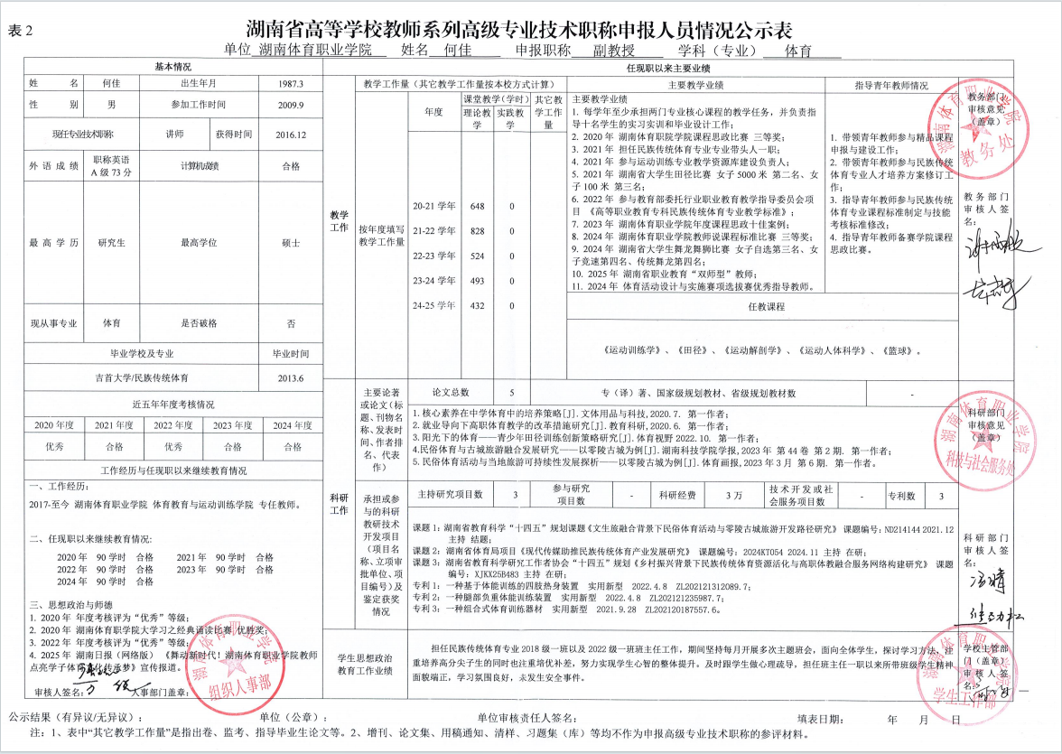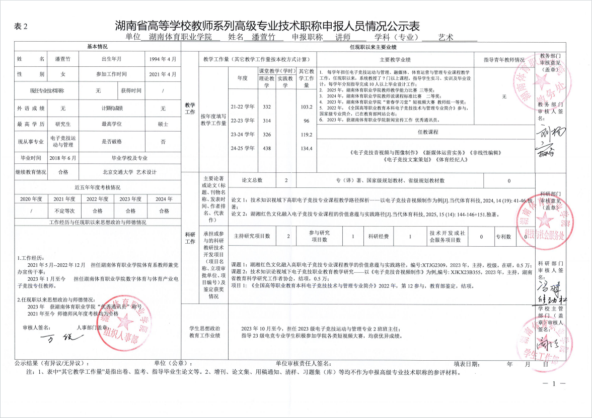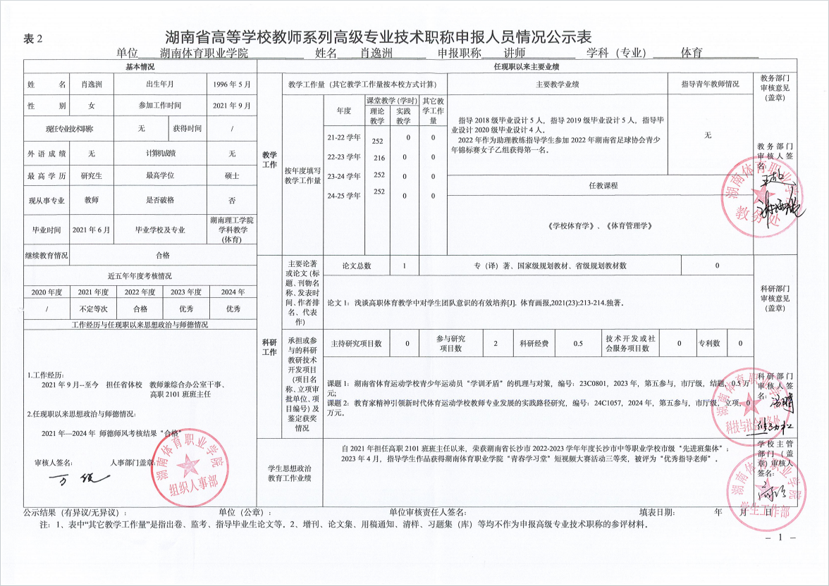 根据湖南省教育厅、湖南省人力资源和社会保障厅《关于做好2025年度全省高级职称评审工作的通知》(湘人社函〔2025〕29号)、《高校教师系列专业技术职称评审改革工作实施办法》(湘体职院职改字〔2022〕9号)、《2025年高校教师系列专业技术职称评审工作方案》(湘体职院职改字〔2025〕10号)等文件要求,经个人申报、部门推荐、资格审查委员会和测评考核委员会审核等程序,现将2025年度学院申报高校教师系列职称评审的人员情况予以公示,公示期为5个工作日,自2025年10月14日起至2025年10月20日止。